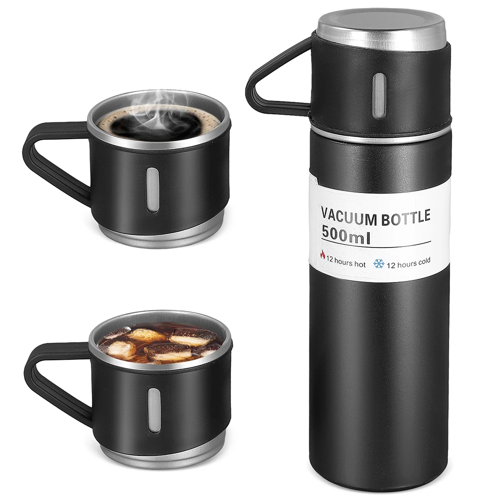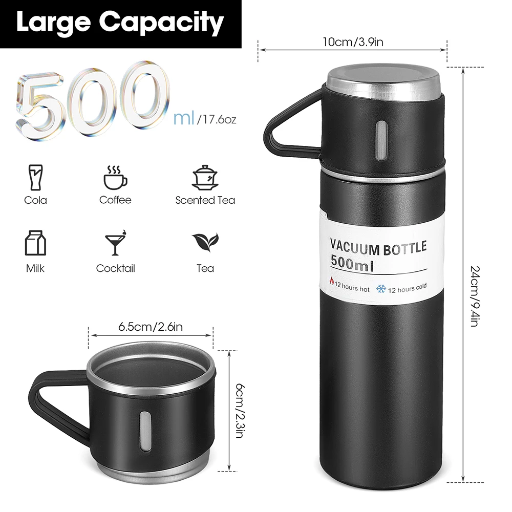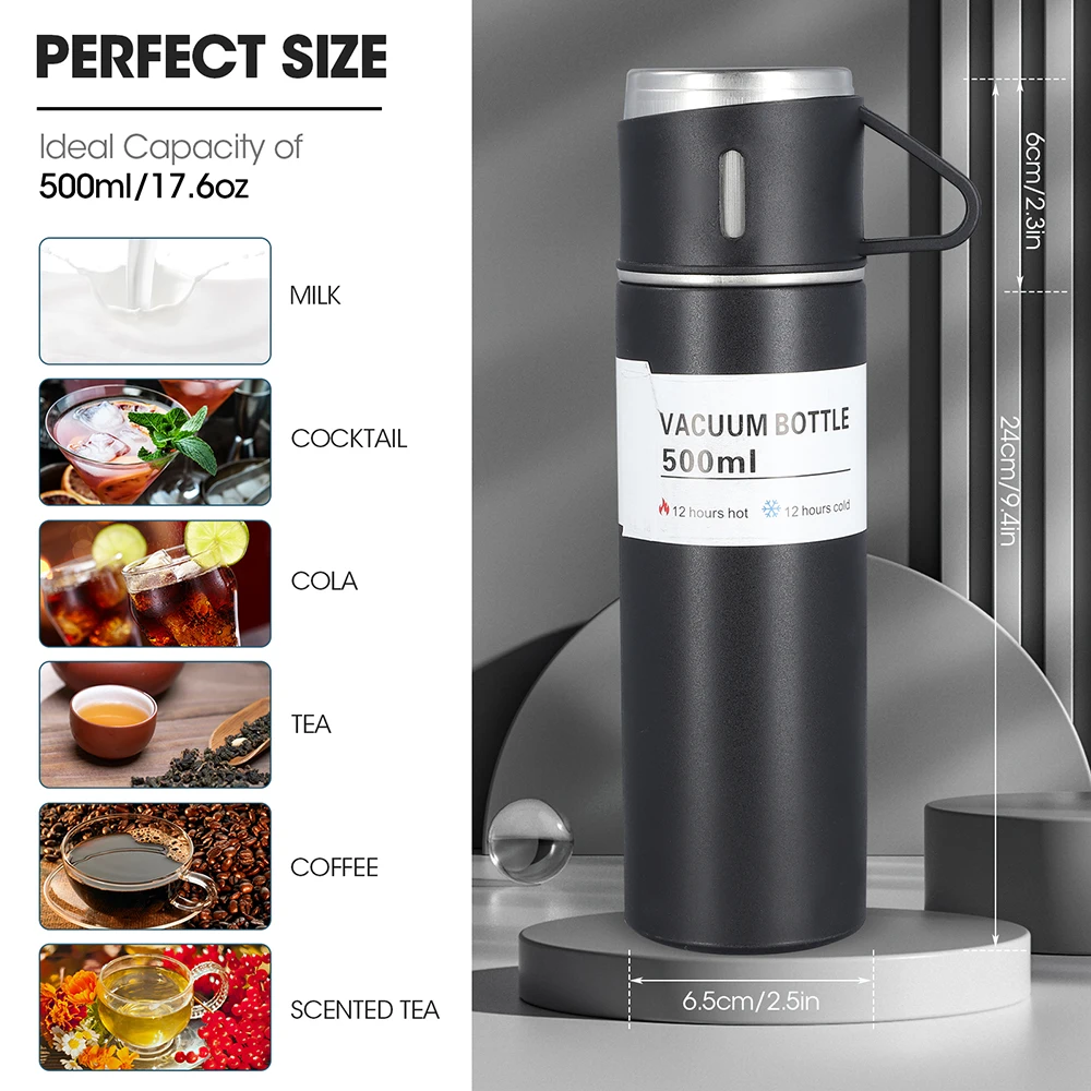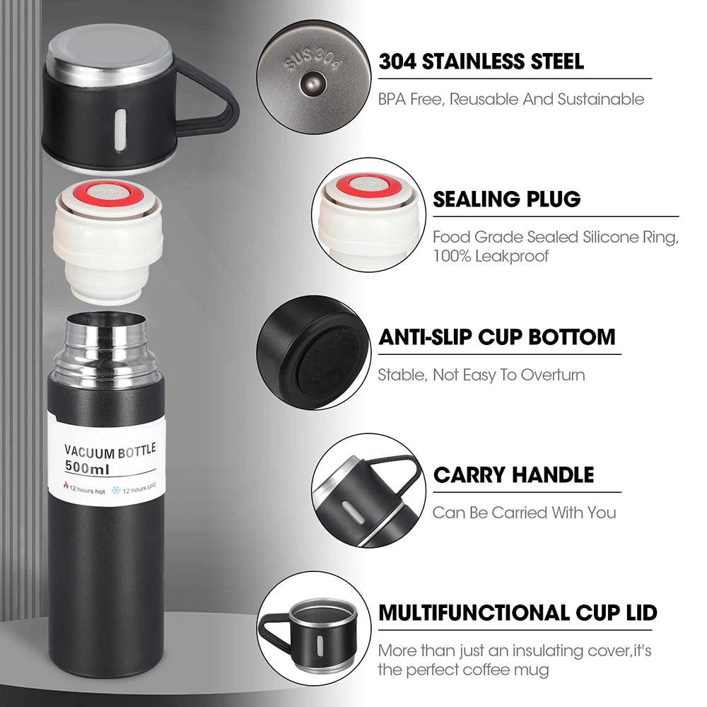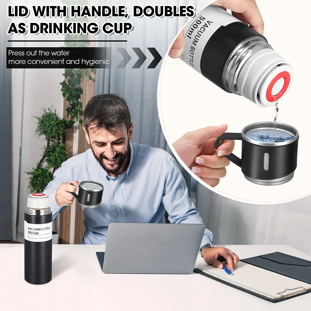 【High-Quality Materials】The insulated bottle is made of high-quality 304 stainless steel, it's sturdy and durable, stylish and environmentally friendly, of course BPA-free.The capacity of the bottle is 500 ml, with 2 lids. The lid is designed for easy drinking, allowing you to easily replenish moisture anytime, anywhere. Moreover, Our products are sustainable & reusable for a long time, say no to single-use plastic!